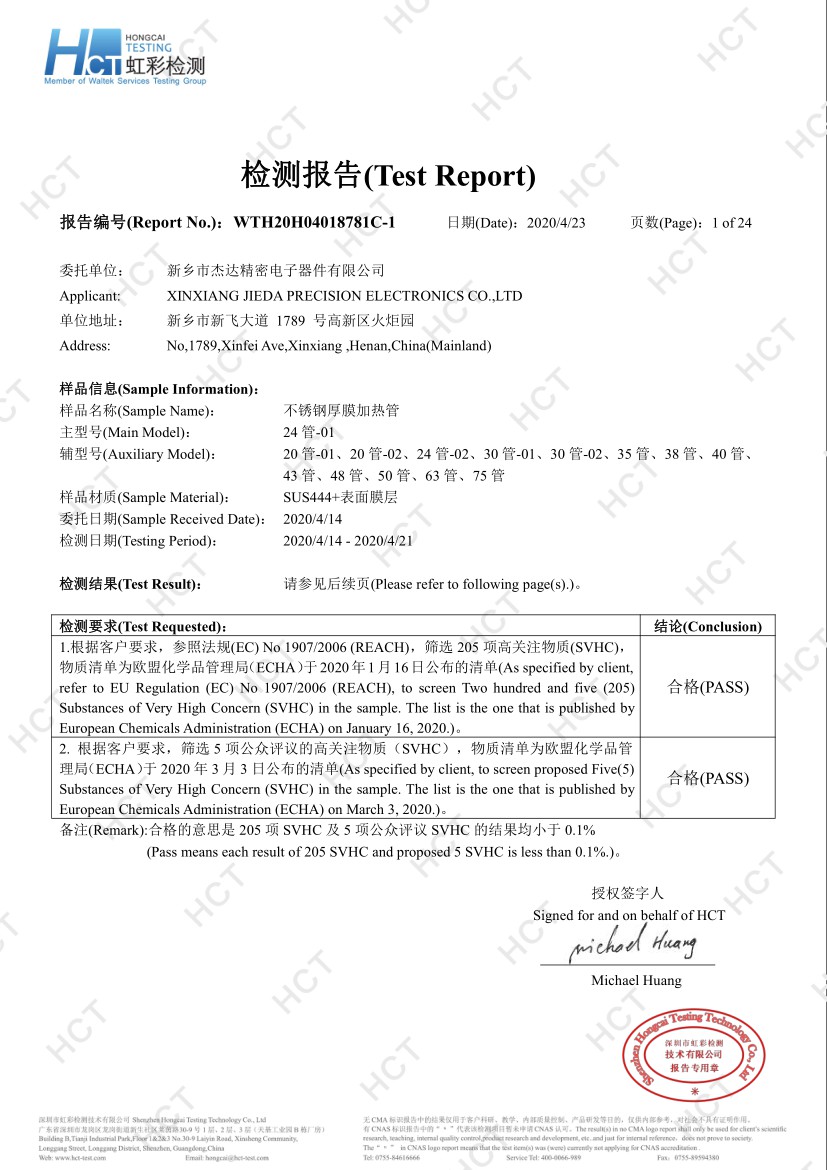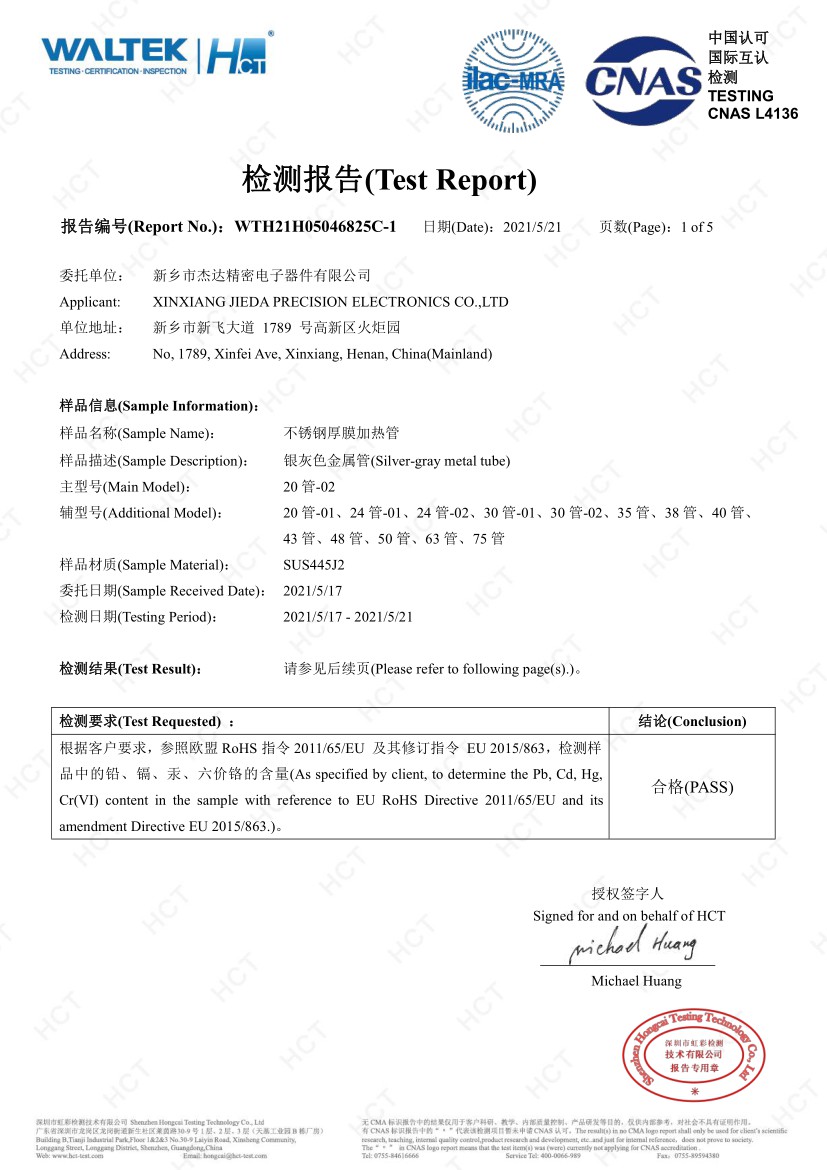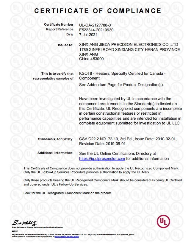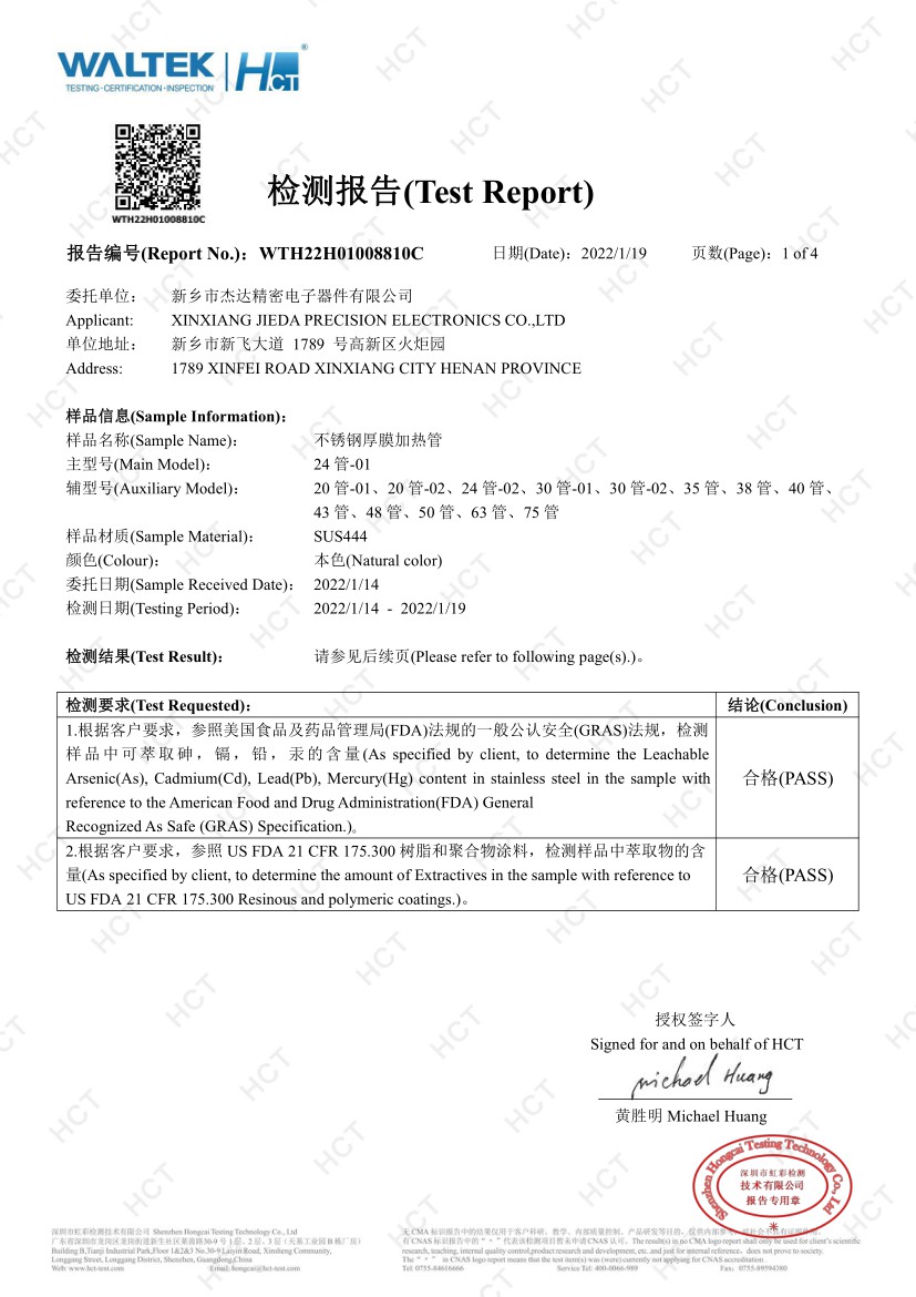 杰達公司專注厚膜電加熱行業十多年,獲授權發明專li5項、實用新型專li百余項;公司通過ISO9001、IATF16949體系認證;產品獲得CQC、UL、飲用水衛生批件等相關安全認證。杰達公司產品覆蓋國內外多個應用領域,受到客戶一致好評,深得用戶信賴!